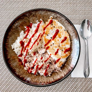 Healthier "Tuna" Onigiri Bowls: organic jasmine rice with sardine & mayo mixture (wild-caught de-boned sardines with avocado mayo, garlic powder & sea salt - tastes just like tuna salad but with way more health benefits!), fried egg, drizzle of non-GMO sriracha. Serve with Furikake sprinkled on top or sheets of organic nori on the side